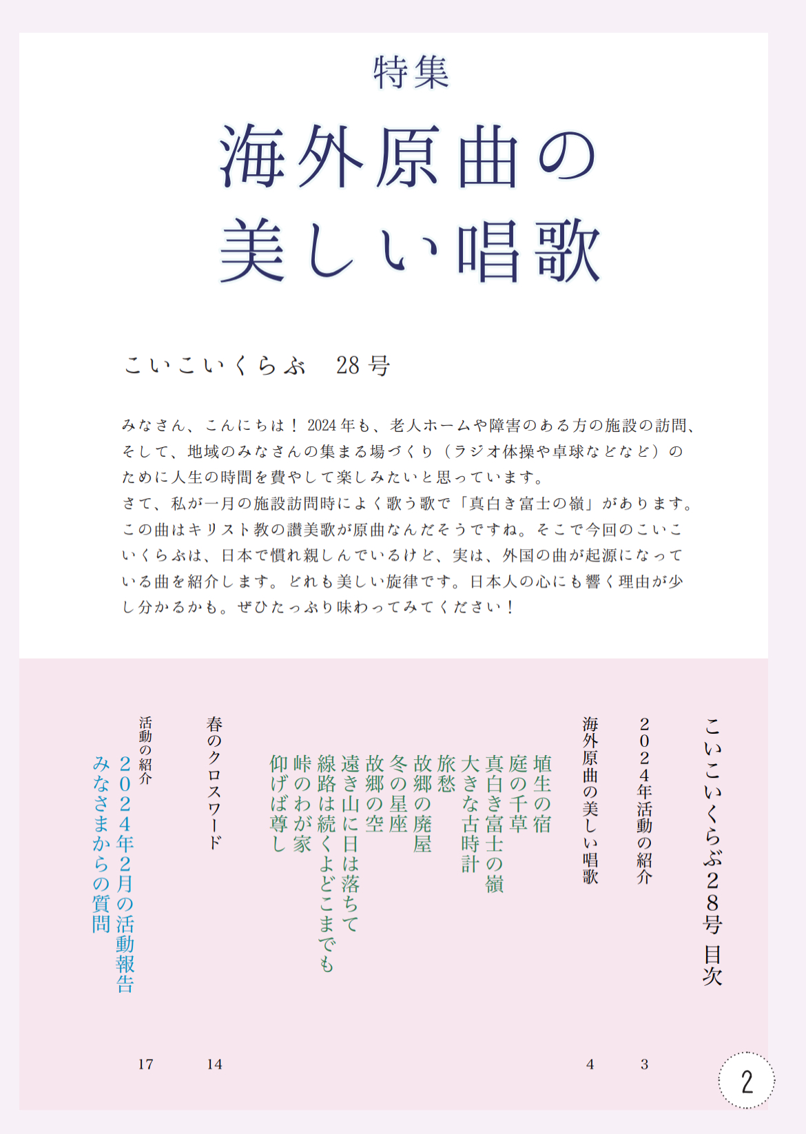 海外在住の日本人のご高齢の方に日本のうたとおしゃべりをお届けしたい! ● 詳細は こちら!● ご支援サイトは こちら! |