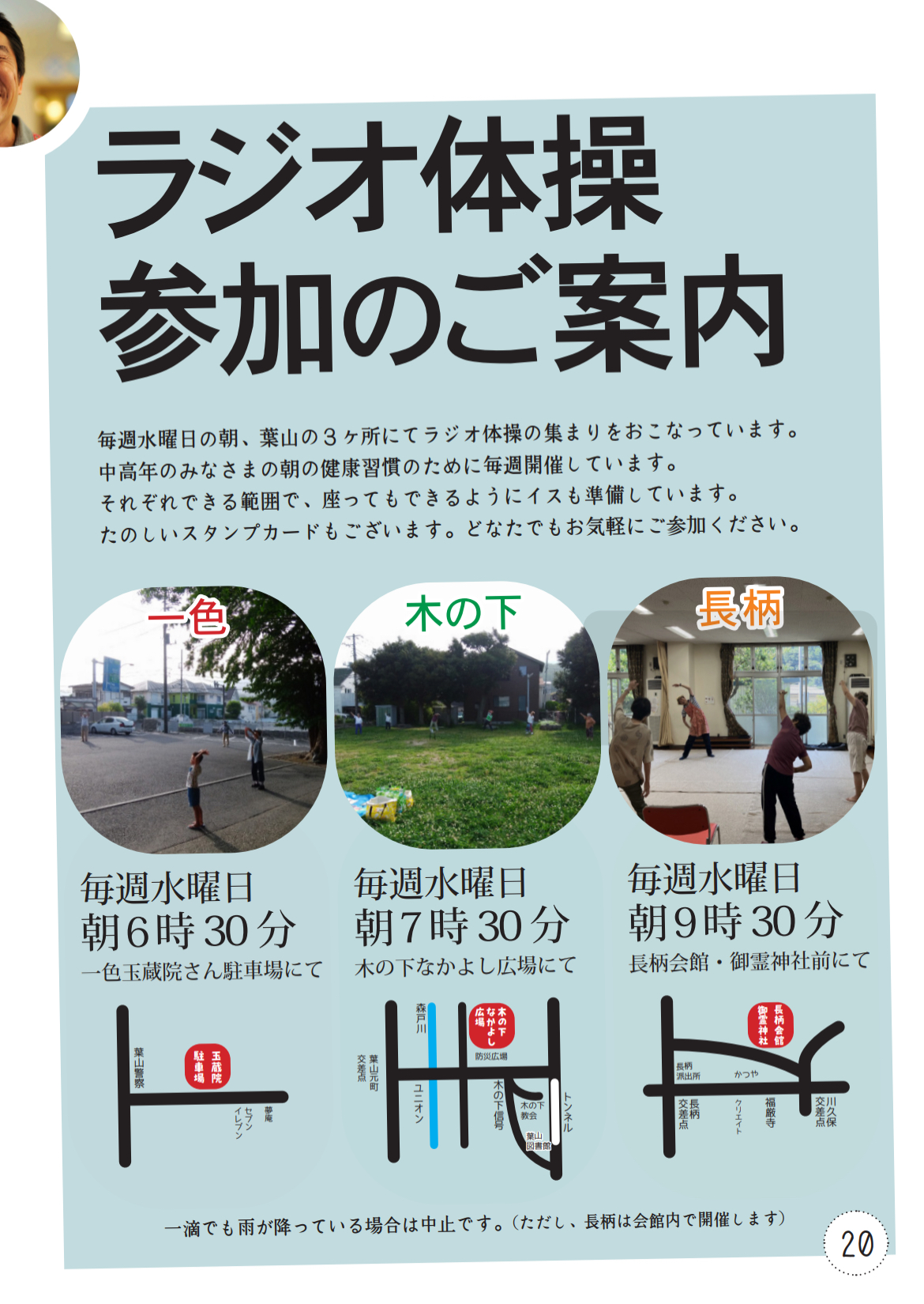 ●6時30分 玉蔵院さんラジオ体操 ●7時30分 なかよし広場ラジオ体操 ●9時30分 長柄会館ラジオ体操 ●10時00分 長柄卓球 ●13時00分 木の下卓球