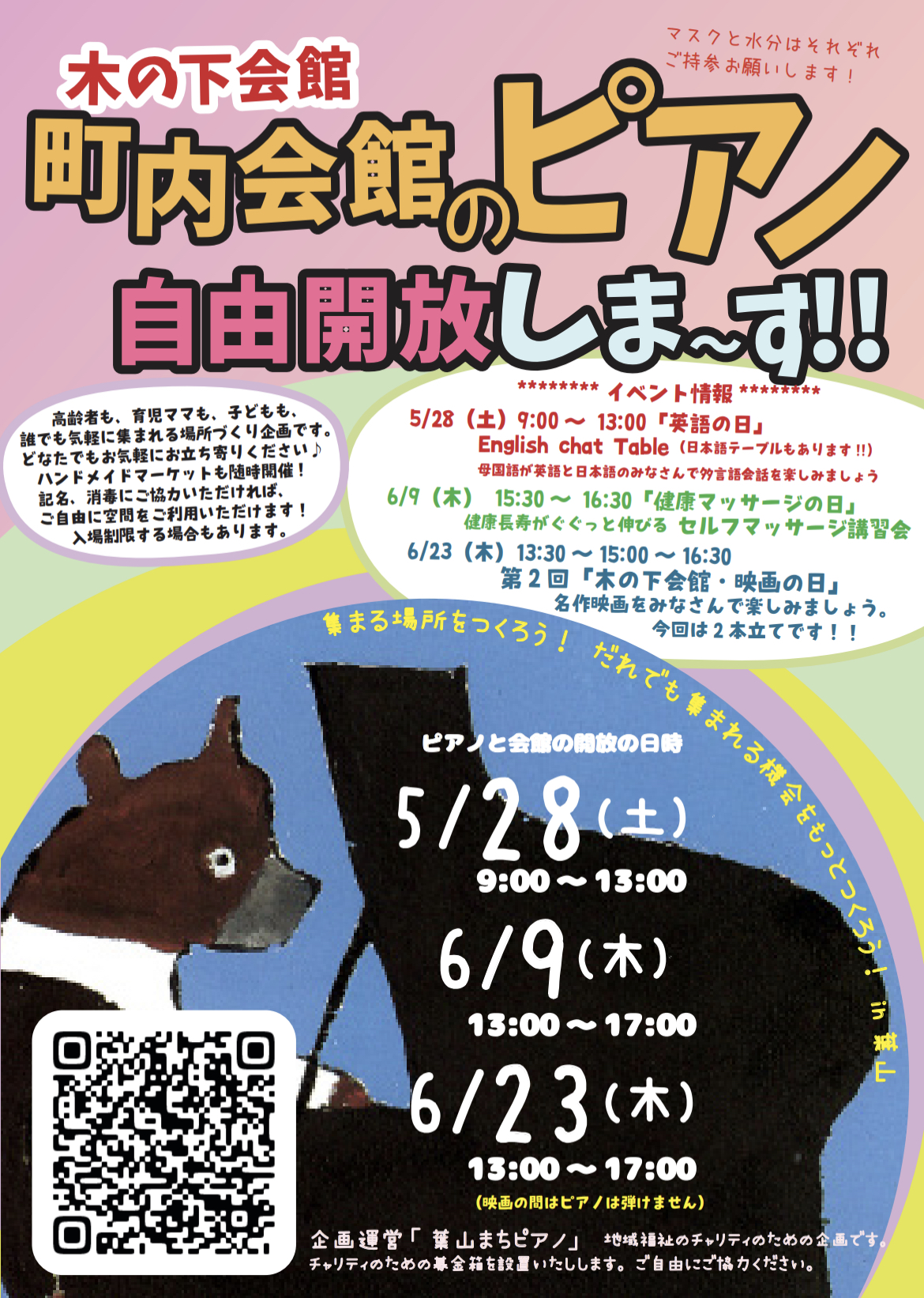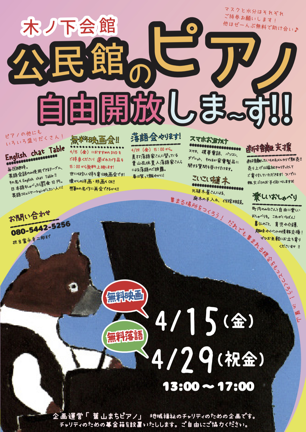 木ノ下会館にてピアノを開放します。ご自由に演奏してください! 【同時開催・入場無料】 お楽しみ映画会 (4/15金 15:00〜) お楽しみ落語会 (4/29祝金 15:00〜)