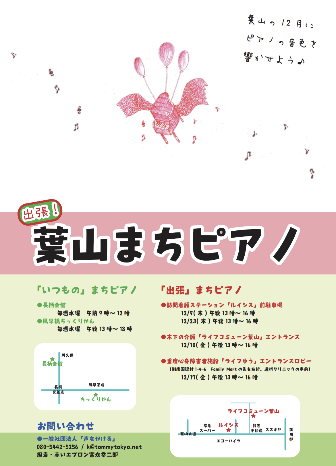 12月の葉山まちピアノは! 4回、出張いたします! Let’s enjoy flying piaaaaano!!!