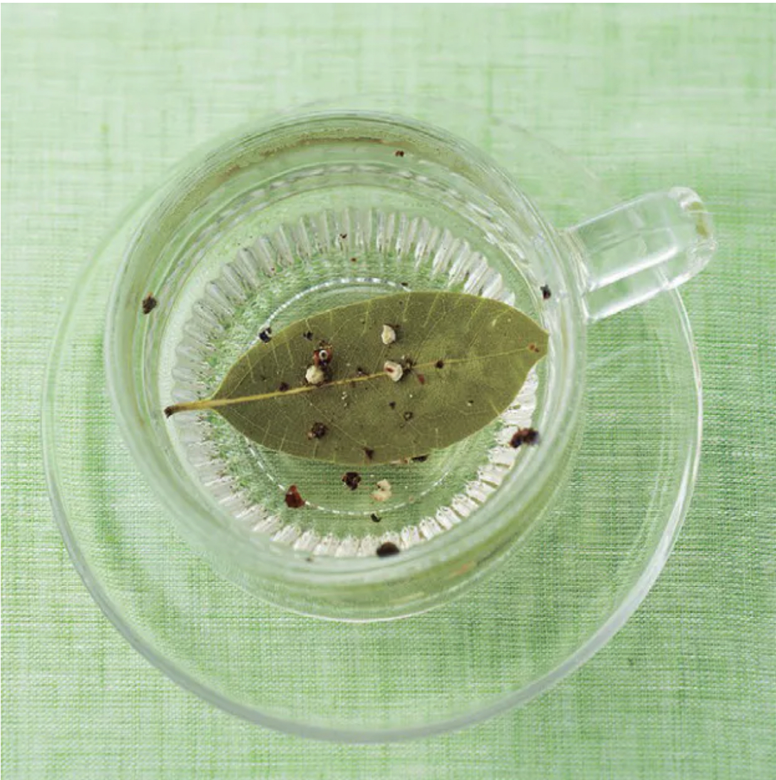 [材料&作り方]月桂樹の葉に切り込みを入れる。耐熱カップに月桂樹と黒コショウ粉末、2~3振り(粗びき3~6粒)を入れ、白湯150~200mlを注ぎ、蒸らす。