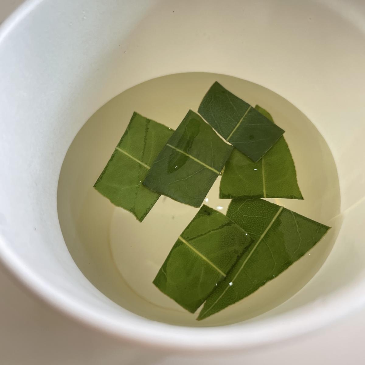 1.耐熱カップに、ハサミで切り込みを入れた月桂樹(乾燥)の葉を入れ、200mlの白湯を注ぐ。