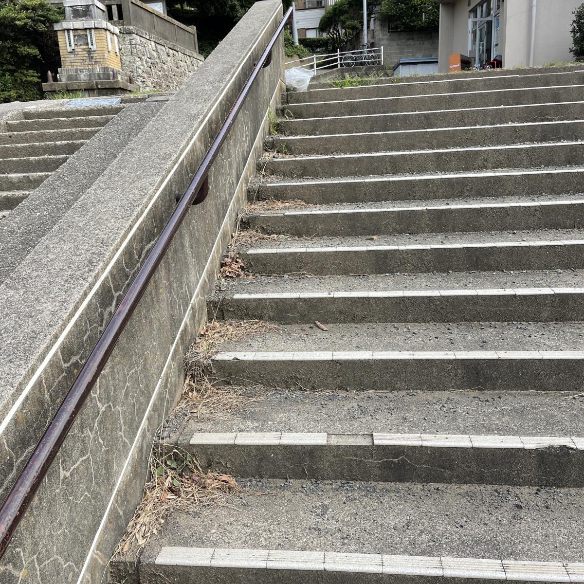 会館につながる階段が、コンクリ片の砂利と泥黙りの雑草で汚れてます。