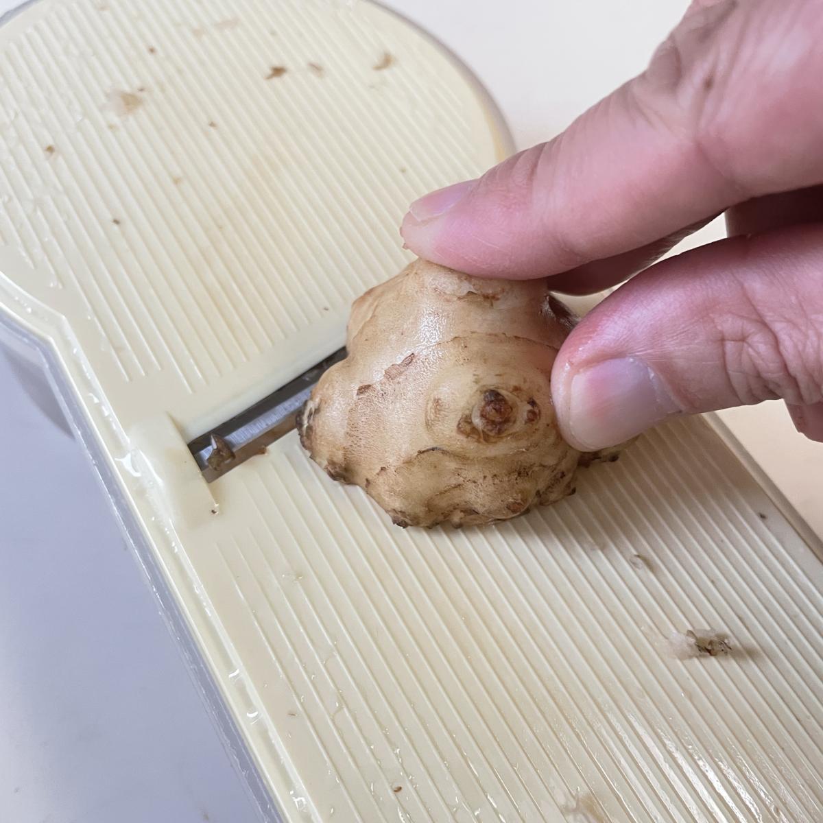 まずはスライサーで薄切りにします。