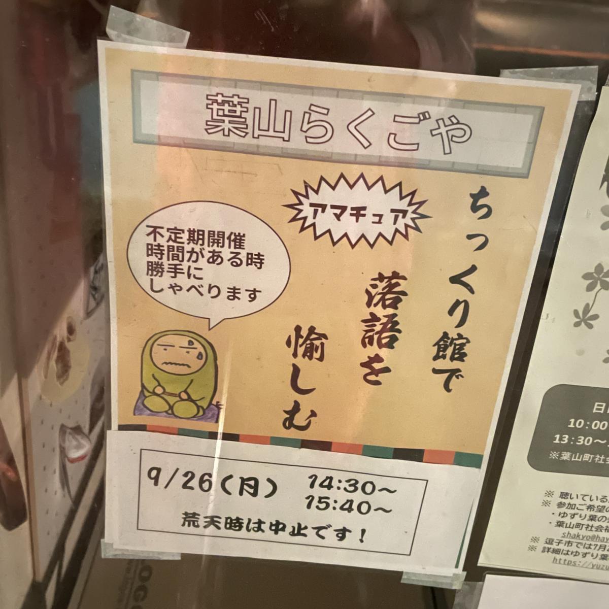 「葉山らくごや」 速報です! 9/26(月)14:30〜、15:40〜 アマチュア落語家さんによる落語が聴ける「葉山らくごや」が初開催されるそうです!場所は風早橋バス停真ん前の「ちっくりかん」にて!